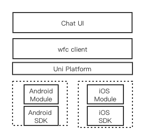 如上图,最下部Android和iOS的SDK是野火IM的标准原生SDK;野火SDK之上是基于UniApp规范的插件原生代码。当应用选用野火插件后,UniPlatform就提供了JS的接口可以调用原生接口。```wfc client```是对接口的进一步封装,封装出更容易使用的接口。最后是使用```wfc client```接口的UI界面。